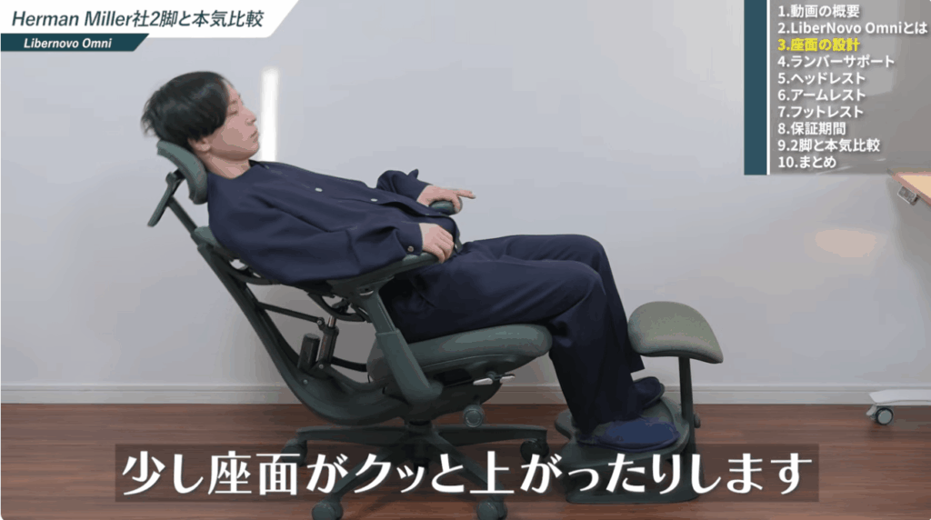 リクライニング時には座面がやや持ち上がるような設計になっていて、座先のクッション性とあわせてリラックスしやすい座り心地につながっています。