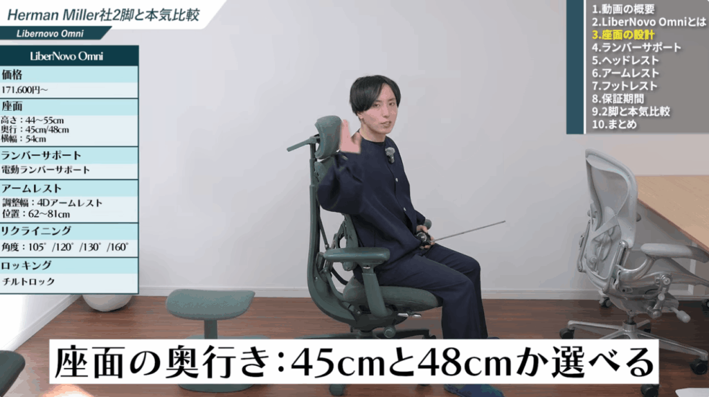 Libernovo Omniの座面奥行きは、45cmと48cmの2パターンから選択可能です。