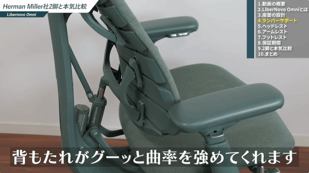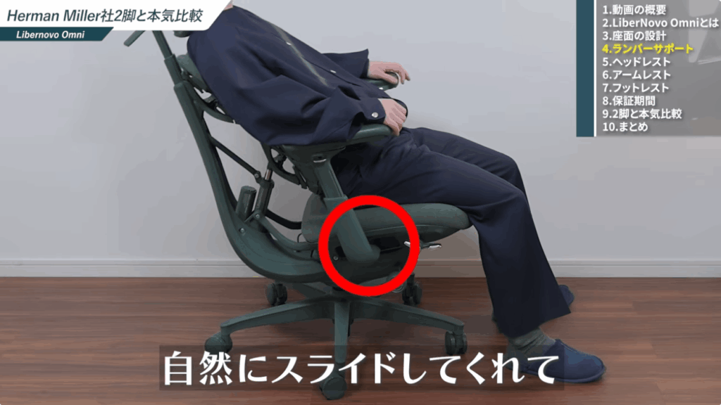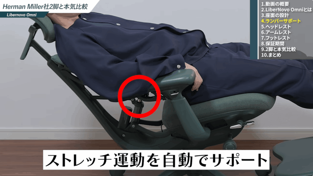 また、リクライニングに連動してアームレストがスライドし、体の動きに追従する点もLibernovo Omniの魅力です。