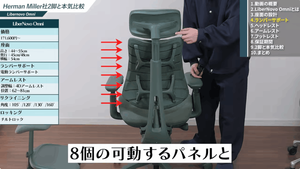 また、8つの可動パネルが連動する構造により、背中や腰まわりのフィット感を細かく調整できます。