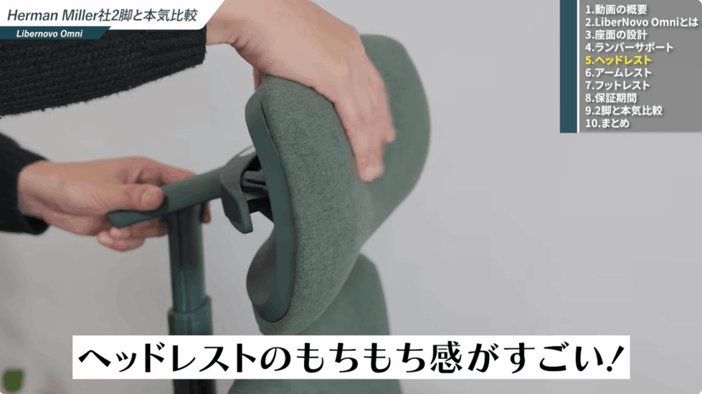 また、Libernovo Omniのヘッドレストは一般的な硬めのヘッドレストとは異なり、もっちりとしたクッション素材でできています。リクライニング時にも頭を預けやすいため、よりリラックスタイムを充実させることができます。
