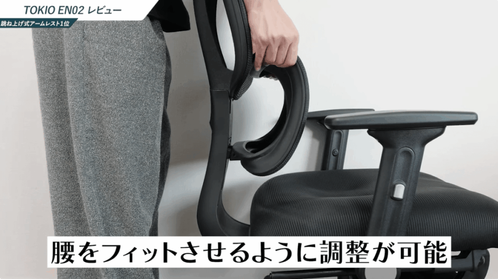 TOKIO EN02の独立型ランバーサポートは、身長に合わせて上下に7.8cm調節することができます。自分の心地いい高さに腰をフィットさせることができます。