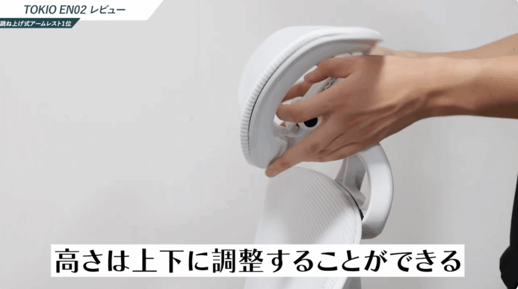 TOKIO EN02では、肘掛けを背もたれ側に跳ね上げることができる「3D+跳ね上げ式アームレスト」を採用しています。アームレストは、前後と高さ、角度を調整することができます。